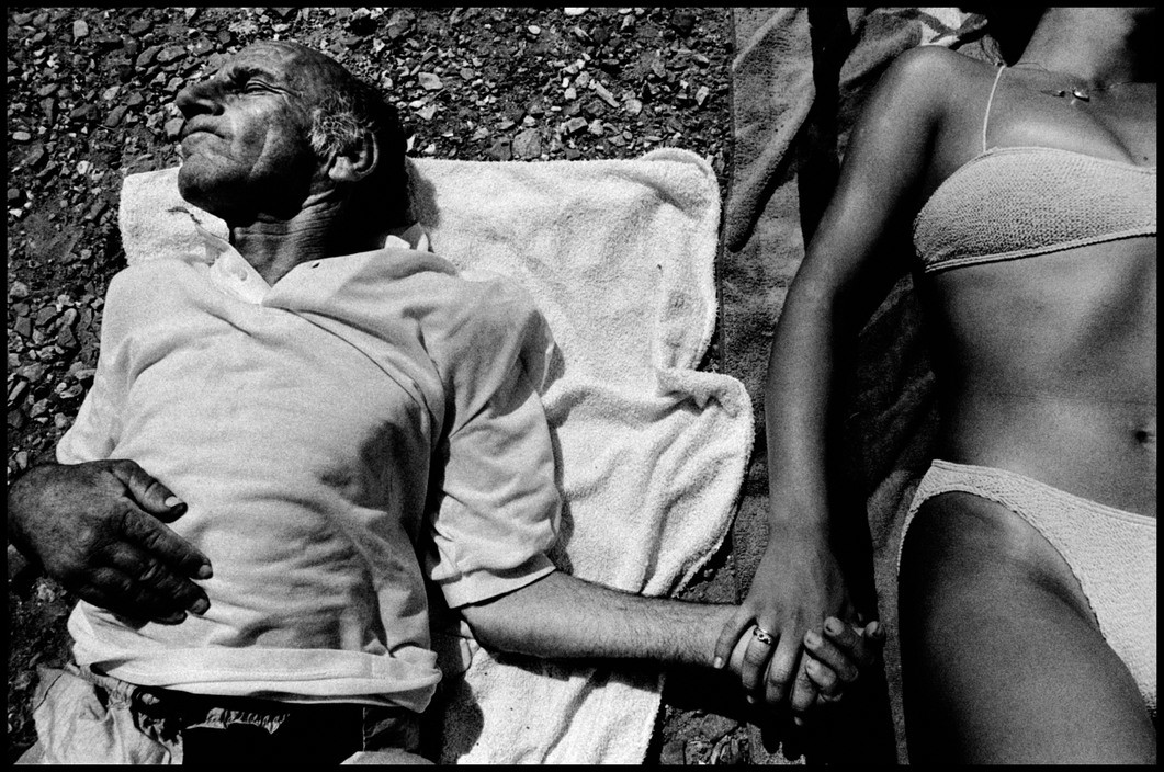A patient and a care worker lie in the sun at Leros beach. Dodecanese islands. Leros, Greece. 1994.