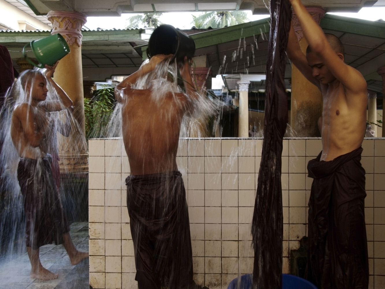 Novices shower at Kha Khat Wain monastery in Bago after morning chores. Bago, Myanmar. September 22, 2009.